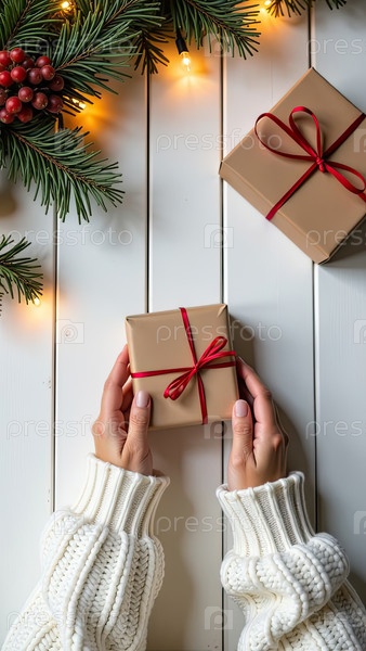 Упаковать подарок на Рождество и Новый год в крафт-бумаге, привязанный веревкой с луком с рождественским декором на белом столовом столе, натуральный декор. Праздничное настроение. Flatlay, background, copy space. AI generated