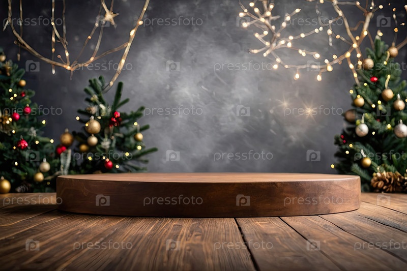 Пустая подиумная площадка для демонстрации продукта, дисплейный монтаж с рождественским декором, боке, секины и фейры. Копирование пространства, Рождество и Новый год. ИИ генерируется