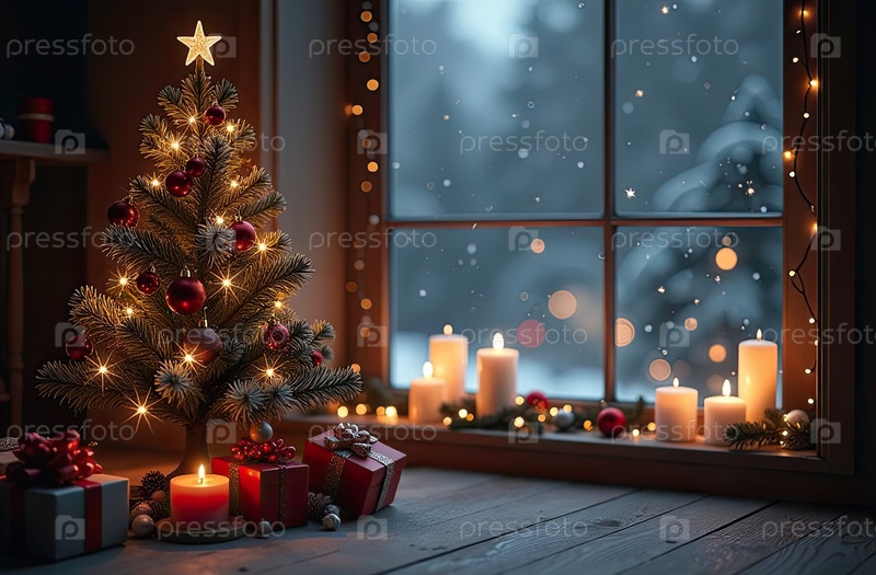Внутреннее уютное окно с рождественским декором и теплыми световыми гирляндами и свечами - внутренний вид зимой и снегом со спасом для текста. Отпразднуйте Рождество и Новый год, елку, боке. ИИ генерируется