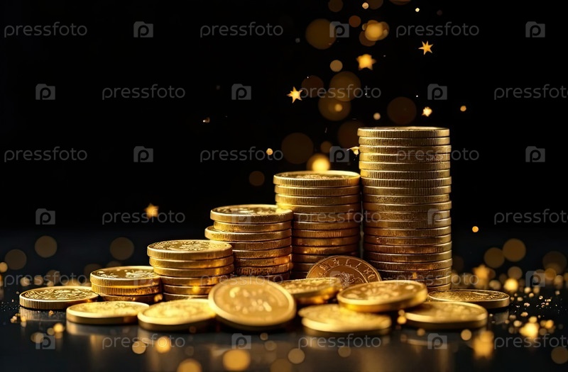 Стол золотых монет на черном фоне с блеском.Сбережения, инвестиции, капитал, бизнес.Искусственный интеллект генерирует