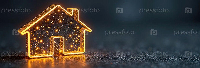 Прозрачное золото светящийся символ дома на сером бетонном фоне с золотым блеском. недвижимость, риэлтор, ипотека, страхование, бронирование, строительство, изоляция, отопление. ИИ генерируется