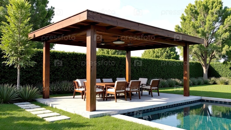 Газебо с зоной для барбекю во дворе дома с барбекью, плитой, столом, крышей