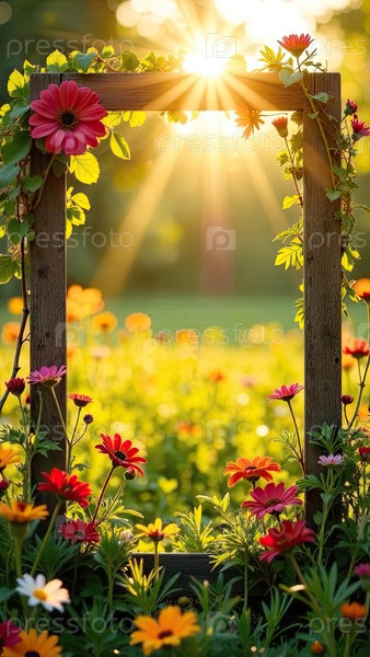 Летние дикие цветы обрамлены солнечными лучами с пространством для текста на фоне летнего поля