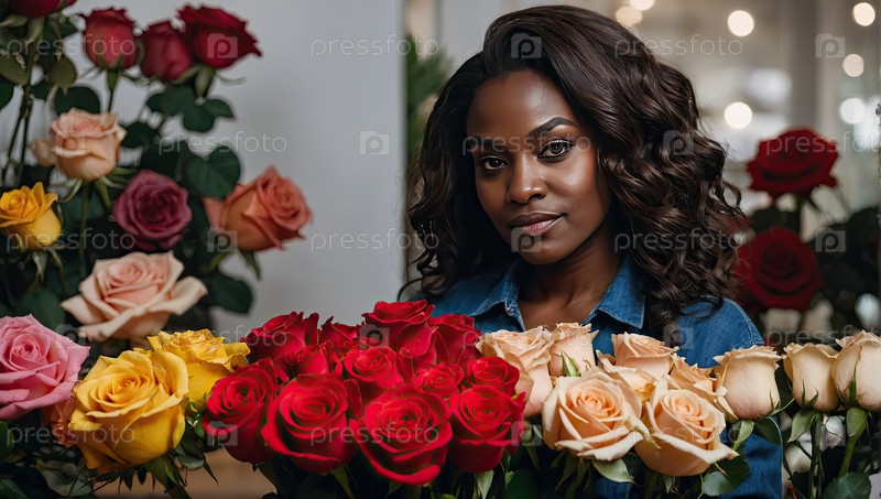 Портрет цветочника африканского происхождения, готовый букет красных и оранжевых роз для празднования Дня святого Валентина