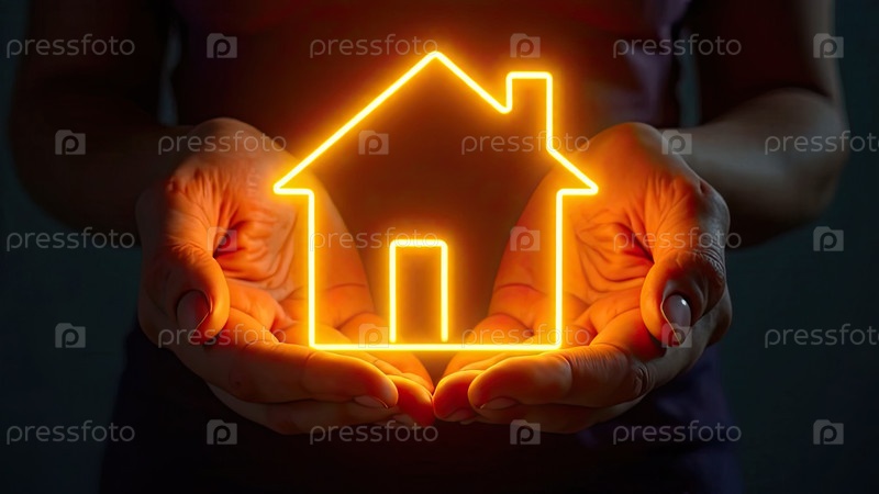 Золото светящийся символ уютного дома В ладонях рук с золотым блеском. Недвижимость, риэлтор, ипотека, страхование, бронирование, изоляция, мечта о собственном доме. ИИ генерируется