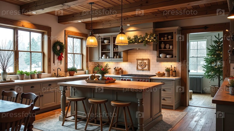 Верхний интерьер уютной современной рождественской кухни, новогоднее настроение, подготовка к празднику, посуда. Рождественский декор современной кухни, снег снаружи окна. ИИ генерируется