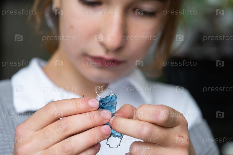 Девушка в школьной форме показывает съемный ортодонтический экспандер, раннее устройство перехвата для улучшения укуса