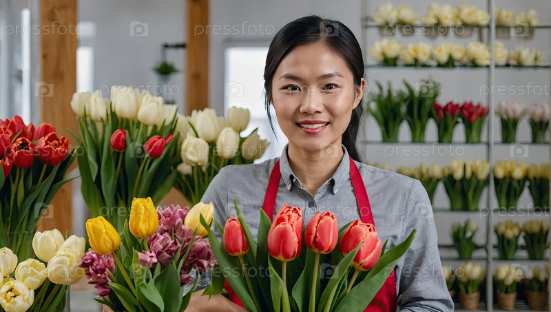 Азиатская девушка-цветочник с полосатым фартуком устраивает букет желтых тюльпанов и розовых пионьев для празднования Сонгкрана, Ханами и весенних торжеств