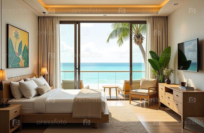 Интерьер гостиничного номера с видом на океан для пляжного отдыха и путешествий