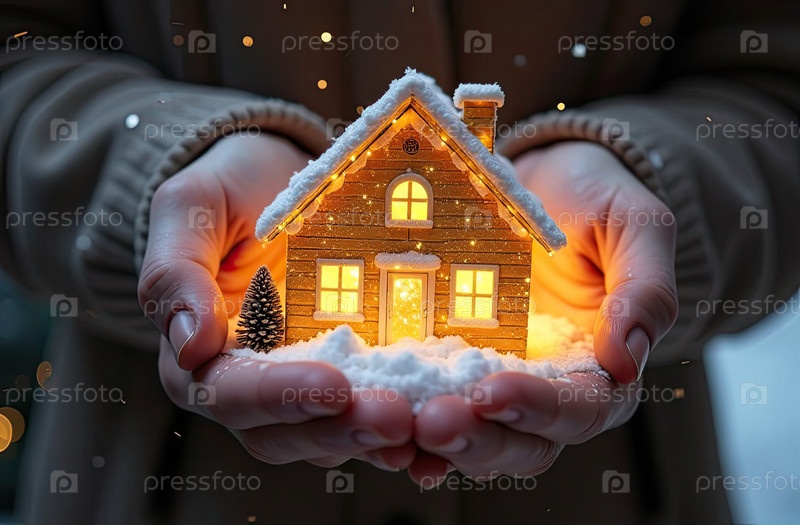 Золото светящийся символ уютного дома на снегу В ладонях рук с золотым блеском. Недвижимость, риэлтор, ипотека, страхование, бронирование, зимовка, изоляция, отопление. ИИ генерируется