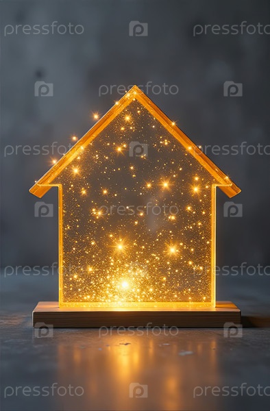 Прозрачное золото светящийся символ дома на сером бетонном фоне с золотым блеском. недвижимость, риэлтор, ипотека, страхование, бронирование, строительство, изоляция, отопление. ИИ генерируется