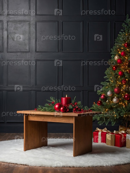 Пустая подиумная площадка для демонстрации продукта, дисплейный монтаж с рождественским декором, боке, секины и фейры. Копирование пространства, Рождество и Новый год. ИИ генерируется