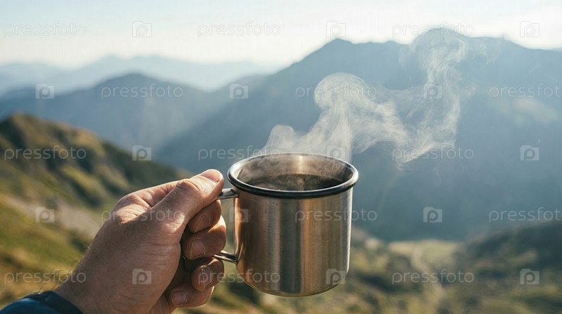 Рука держит паровую металлическую кружку на горном фоне, утренний перерыв, путешествия на открытом воздухе, отдых в кемпинге, наслаждение природой
