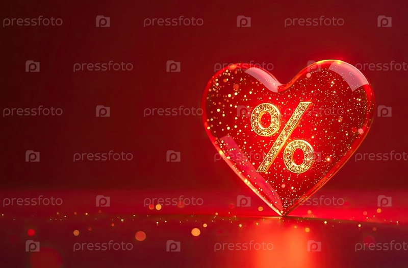 Неон светящийся золотой процентный знак на Святого Валентина красный фон любви с красным сердцем, блеск. распродажа святого Валентина, скидки. баннер, флаер со копировальным пространством. ИИ генерируется