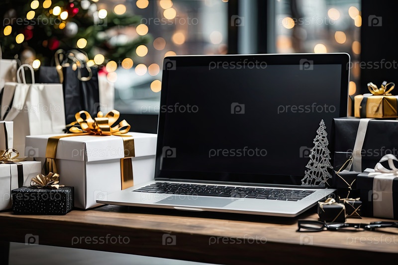 Макет ноутбука с черным экраном на столе в офисе с коробками для подарков сотрудникам, магазины, корпоративные подарки, Черная пятница, Рождество и Новый год