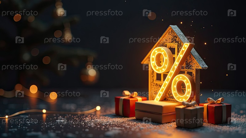 Прозрачный золотой светящийся символ процент в доме на рождественском фоне с золотистым блеском. черная пятница, скидка, купон, покупка, продажа, риэлтор, ипотека, страхование, бронирование. ИИ генерируется