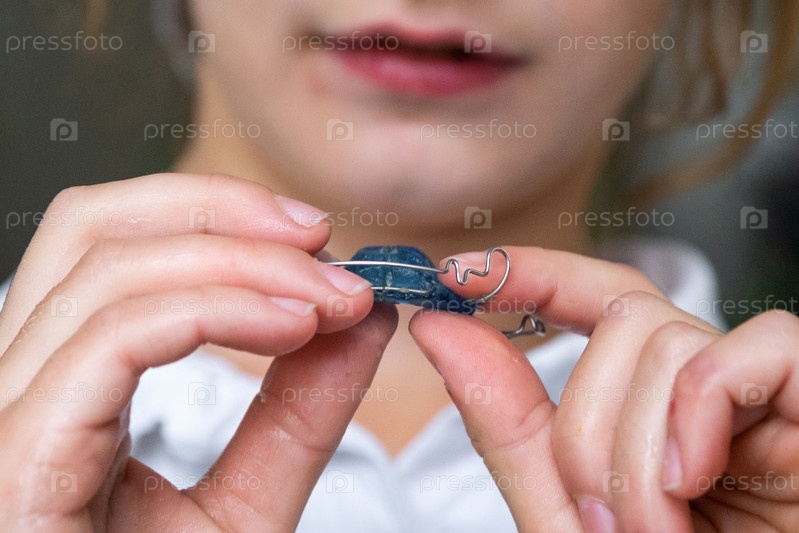 Близкий план рук, держащих ортодонтическую пластину, детское устройство для укуса и расширения челюсти