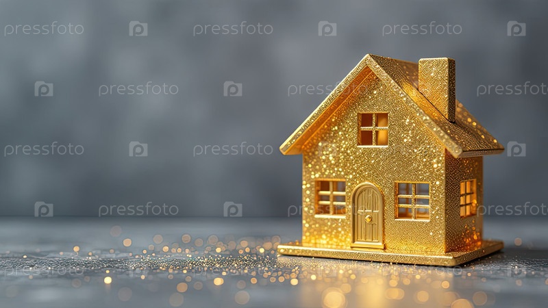 Золотой символ дома на сером бетонном фоне с золотым блеском. недвижимость, риэлторская деятельность, ипотека, страхование, бронирование, строительство, изоляция, отопление. ИИ генерируется