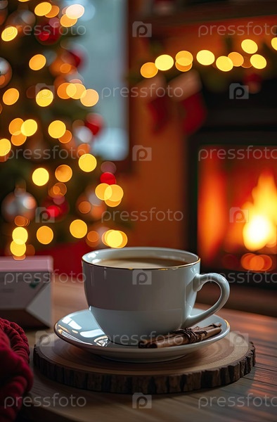 Теплая чашка кофе возле камина в уютном теплом трикотажном платье и рождественский декор.Уютная зима, Рождество, Новый год. ИИ генерируется