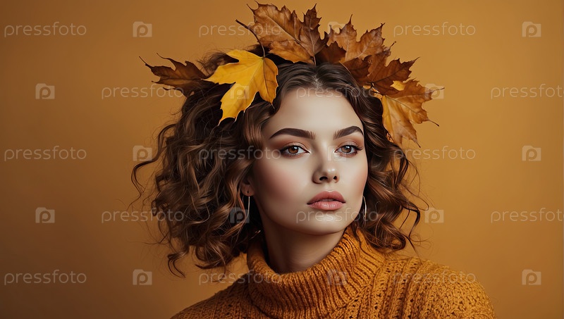 Молодая женщина с кудрявыми волосами и короной осенних листьев, оранжевый фон, осенняя мода, сезонная красота, уютное настроение
