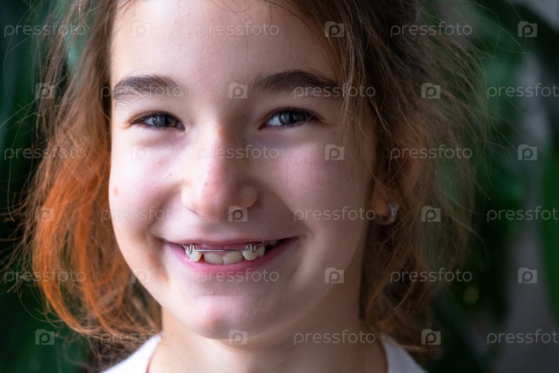 Счастливая стоматологическая пациентка, школьница после ортодонтического лечения, показывает улучшение зубов с съемным расширителем