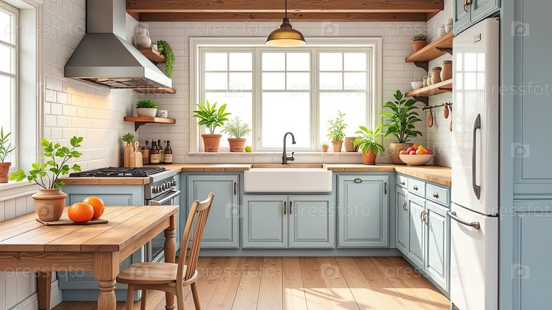 Белый интерьер уютной современной светлой деревенской кухни, горшечные растения, открытые полки для хранения посуды
