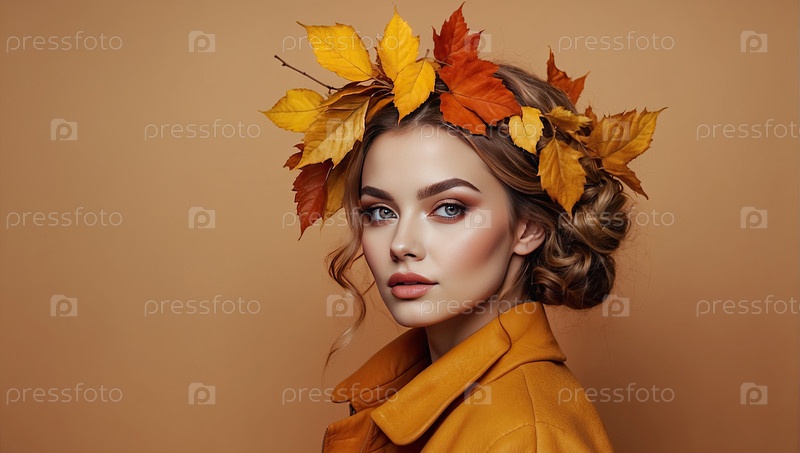 Белая женщина с рыжими волосами и оранжевой короной из кленовых листьев, портрет осенней красоты, яркое тепло, осенний сезон