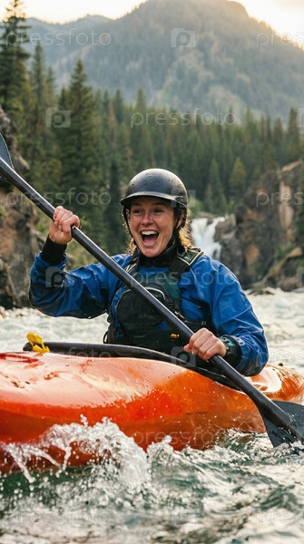 Улыбающаяся женщина в зеленом снаряжении катание на байдарках по горной реке, одиночные приключенческие путешествия, веселые водные виды спорта, энергия на открытом воздухе, волнение от речного путешествия