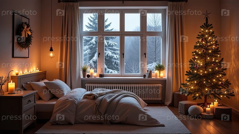 Уютная спальня с кроватью у окна с рождественским декором и елкой, теплыми гирляндами света и свечами - вид изнутри зимой и снегом. Отпразднуйте Рождество и Новый год, рождественское настроение. ИИ генерируется