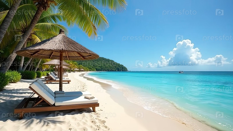 Панорама тропического райского пляжа с пальмами и белым песком на берегу океана. поездка к морю в теплом летнем климате, туристический отдых. ИИ генерируется