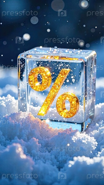 Неон светящийся золотой процентный знак в кубике льда на снежном фоне снаружи, блеск и снежинки Зимние распродажи и скидки, Черная пятница, Новый год, рождественский баннер, флаер. AI generated