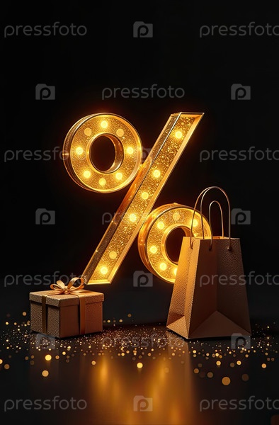 Неон светящийся золотой процентный знак на черном фоне. витрина магазина для Черной пятницы, распродажи, скидки, сумки для покупок. баннер, флаер. AI generated