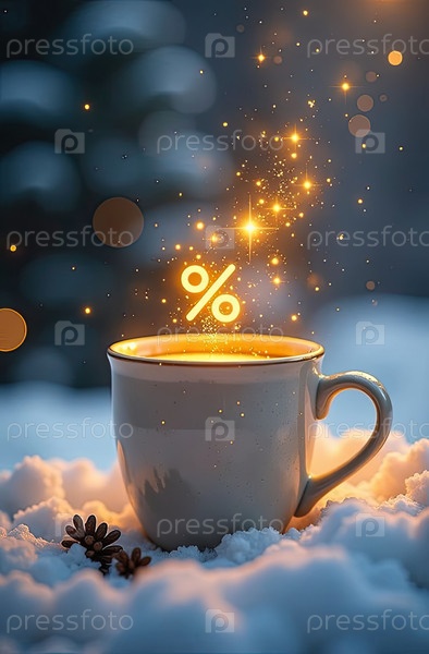 Неон светящийся золотой процентный знак на кружке с горячим кофейным напитком, паромом, блеском и снегом. зимние распродажи и жаркие скидки, Черная пятница, Новый год, Рождество. баннер, флаер с копировальным пространством. AI generated