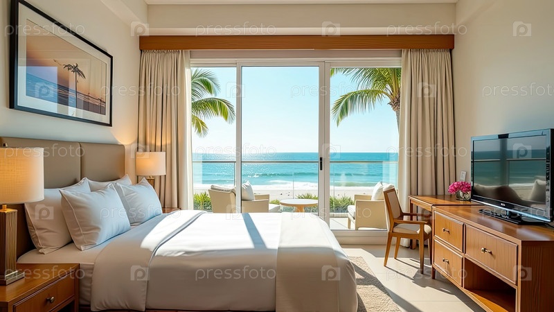 Интерьер гостиничного номера с видом на океан для пляжного отдыха и путешествий