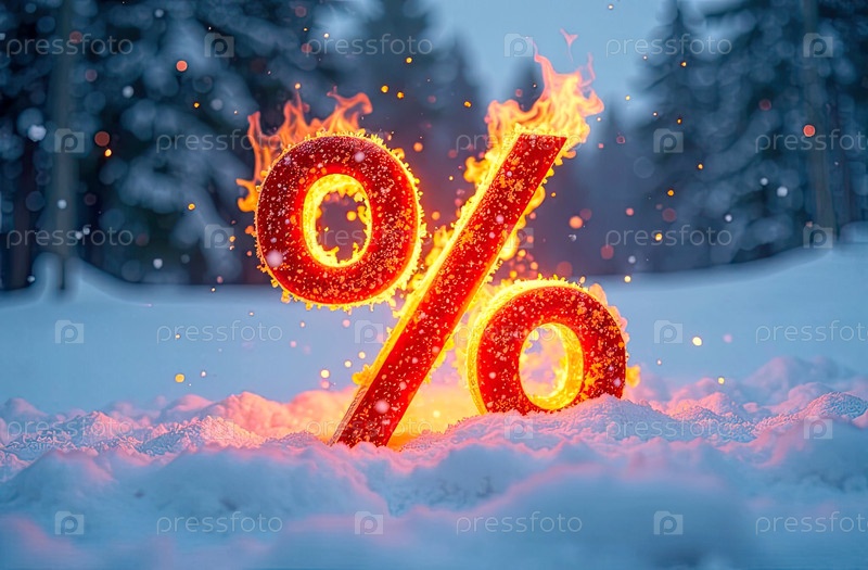 Горящий с огнем процентный знак на снежном фоне снаружи, блеск и снежинки. Зимняя распродажа и скидки, Черная пятница, Новый год, Рождество. баннер, флаер со копировальным пространством. ИИ генерируется