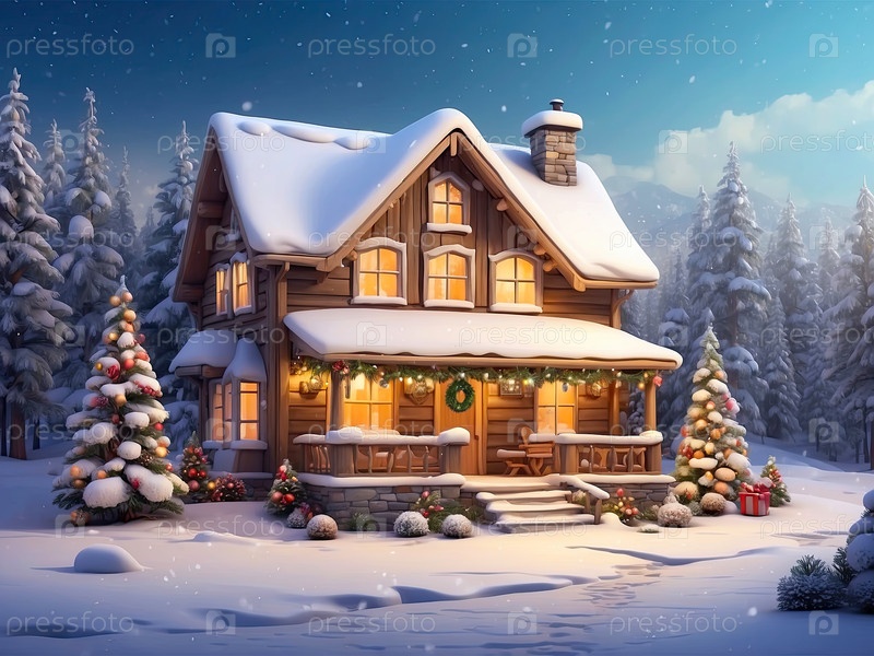 Мультфильм Уютный деревянный дом в горах ночью с рождественскими елками и подарками зимой на снегу и снегопаде с Рождественским декором - праздничная открытка