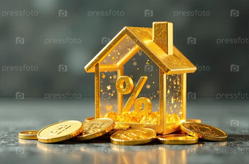 Золото светящийся символ процент в доме на стеке золотых монет на сером бетонном фоне. строительство жилья, скидка, купон, покупка, продажа, риэлторская деятельность, ипотека, страхование, бронирование. AI generated