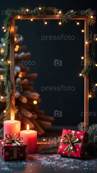 Приглашение на рождественскую открытку с пространством для текста в рамке на черном фоне со светящейся елкой и блеском