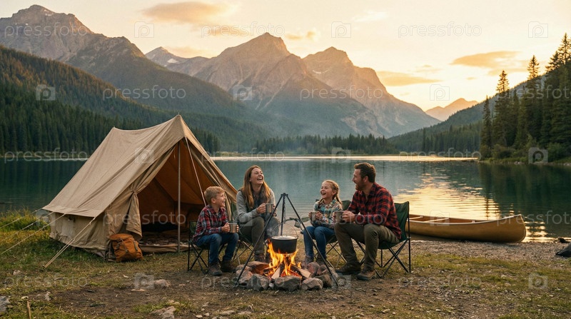 Семейный кемпинг у горного озера при закате солнца, палатки и костер, мирные моменты путешествия, отдых на свежем воздухе, выход в природу