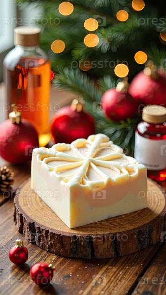 Ручно сделанное натуральное эко мыло на столе с бутылками с ароматизатором, красителем и основой для мыла на рождественском фоне. Подарок, подарок, ремесло на Новый год и Рождество. Производство любительского мыла, домашнее изготовление. ИИ генерируется;