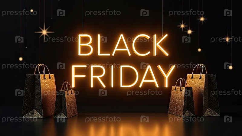 Неоновые светящиеся золотые буквы "Черная пятница" на черном фоне. витрина магазина для Черной пятницы, распродажи, скидки, сумки для покупок, созданные ИИ