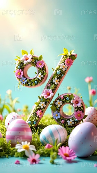 Процентный знак и пасхальные яйца в солнечных лучах, украшены весенними пастельными цветами
