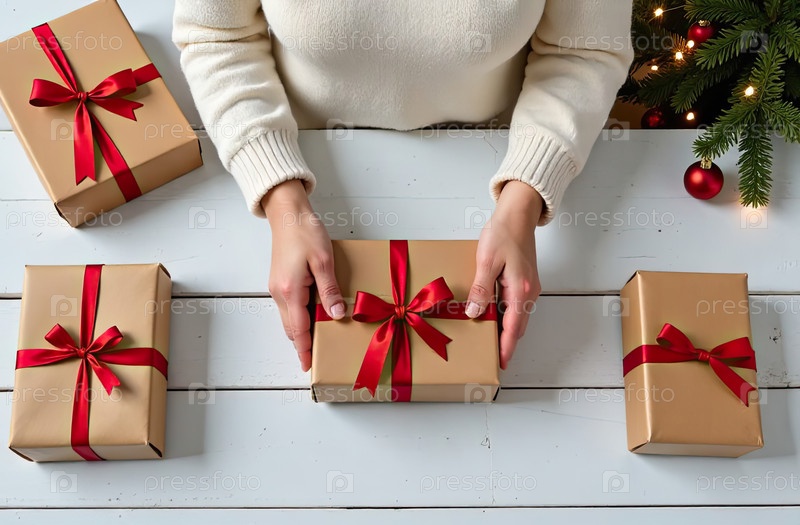Упаковать подарок на Рождество и Новый год в крафт-бумаге, привязанный веревкой с луком с рождественским декором на белом столовом столе, натуральный декор. Праздничное настроение. Flatlay, background, copy space. AI generated