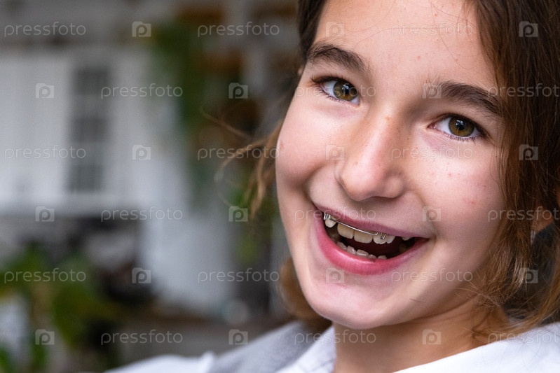 Счастливый ребенок улыбается после ношения съемной зубной пластины, ортодонтического прибора для педиатрической помощи