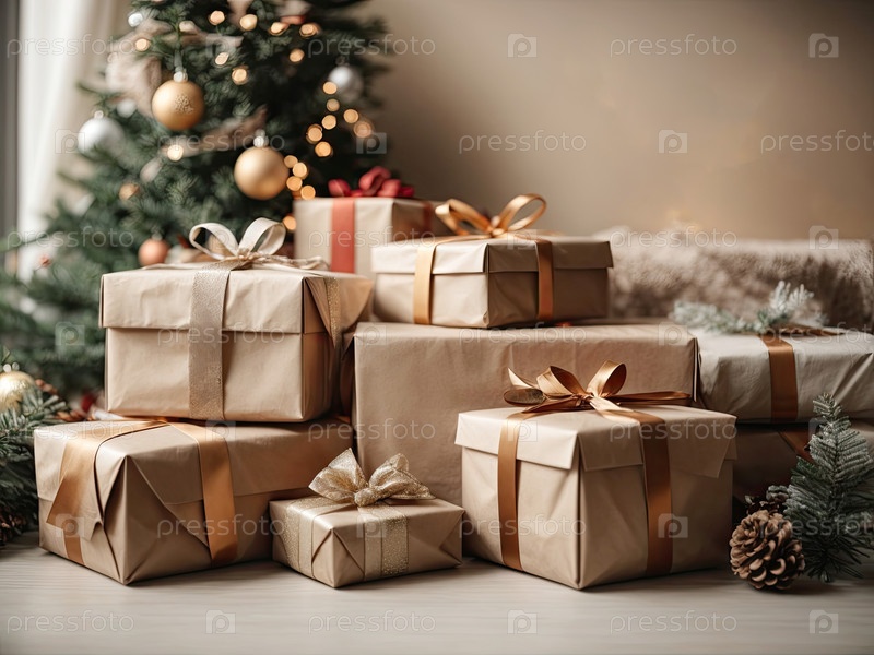 Рождественский фон с подарочными коробками с луками в нейтральных тонах естественного эко-стиля, боке и фейри-светом, рождественская елка во внутреннем интерьере дома. праздничное настроение Рождество и Новый год, открытка, созданный ИИ