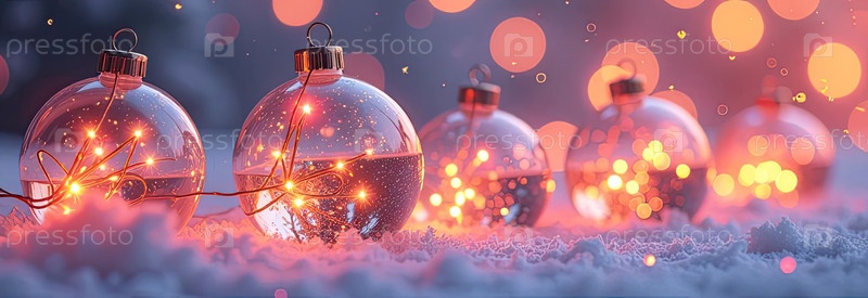 Гирлянда светящихся прозрачных шаров с золотыми огнями на фиолетовом фоне с блестками и боке. поздравительная карточка на Рождество и Новый год. ИИ генерируется