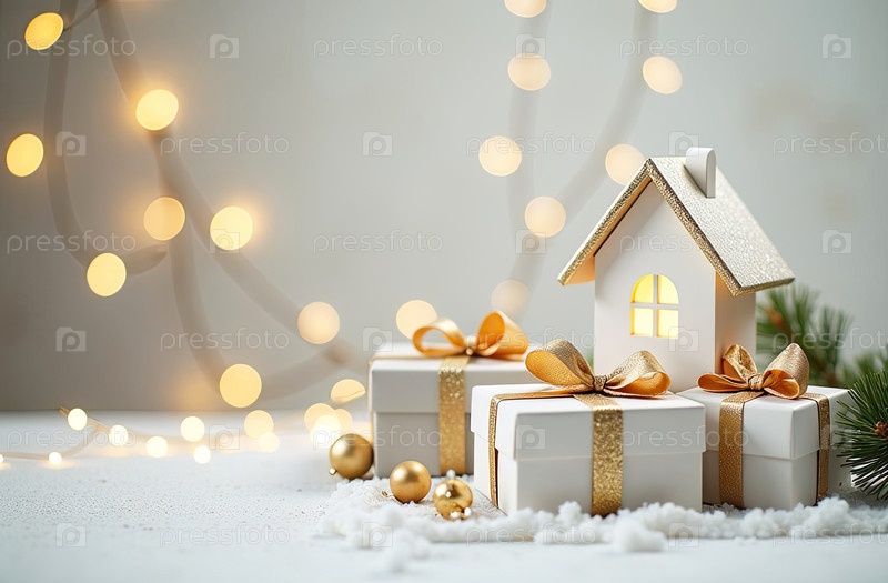 Золото-белый символический дом и подарочная коробка под рождественской елкой на столе Рождественский фон с золотым блестком на поздравительной карточке