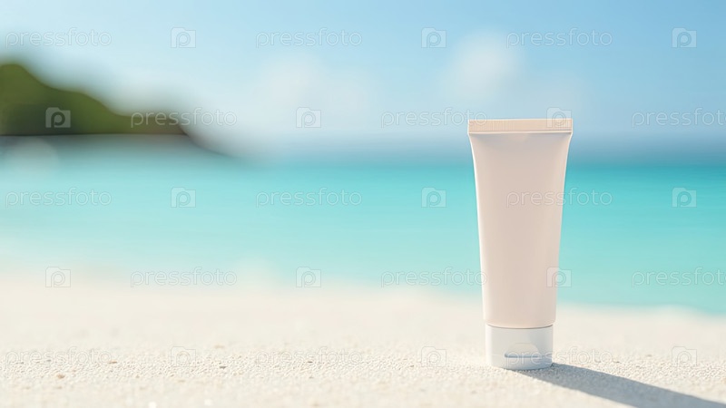 Белая трубка макет солнцезащитного крема на белом песке пляжа на фоне синего океана. Ультрафиолетовая защита кожи, солнцезащитный крем. ИИ генерируется