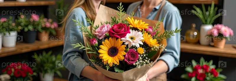 Букет роз и весенних цветов в руках флориста, упакованный в крафт-бумагу в интерьере цветочного магазина, доставка на праздник.Весна, 8 марта, женский день, день рождения. ИИ сгенерировано