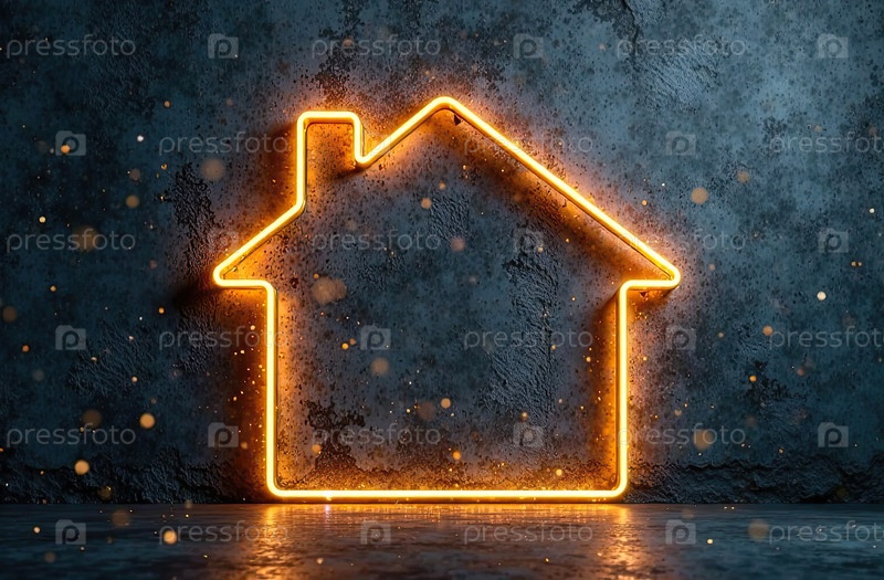 Прозрачное золото светящийся символ дома на сером бетонном фоне с золотым блеском. недвижимость, риэлтор, ипотека, страхование, бронирование, строительство, изоляция, отопление. ИИ генерируется